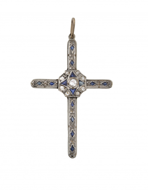 63. Cruz colgante estilo Art-Decó de zafiros y diamantes en oro blanco con brillante central