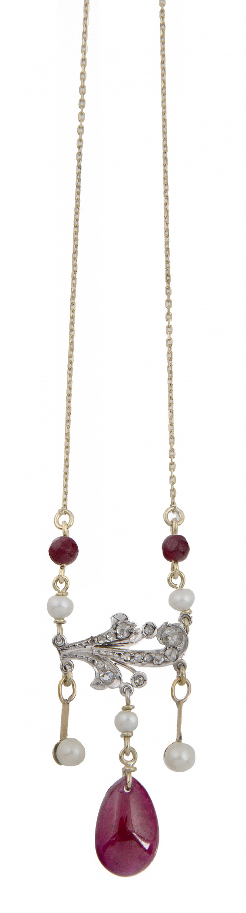 Pendentif estilo Belle Epoque con diamantes perlas y rubíes, con gran gota de rubí colgante