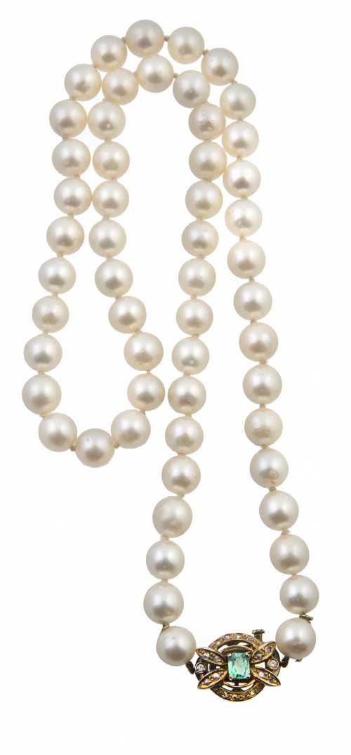 Collar de un hilo de perlas cultivadas japonesas con cierre de esmeralda y diamantes