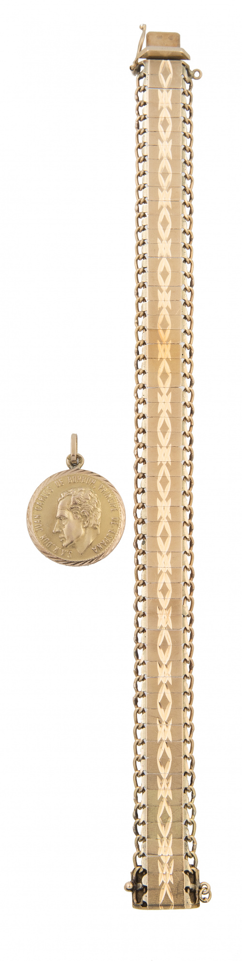 98. Pulsera con diseño de banda articulada con decoración grabada y moneda colgante