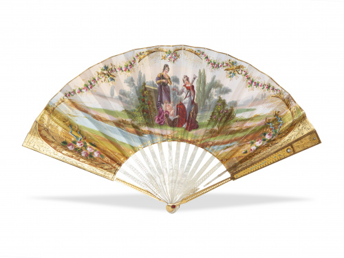 Abanico de niña con país de papel, grabado, pintado e iluminado con alegorías del Amor, por ambas caras; varillaje de nácar calado, los padrones de metal troquelado con piedras simuladas y un putto.