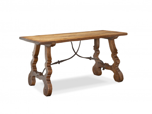 Tablero rectangular, apoya sobre patas de lira, con fiadores de hierro.