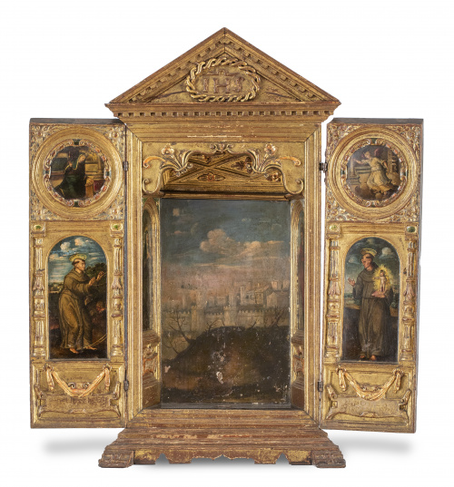 Home / SUBASTA OCTUBRE / Altar portátil en madera tallada, policromada y dorada.Es