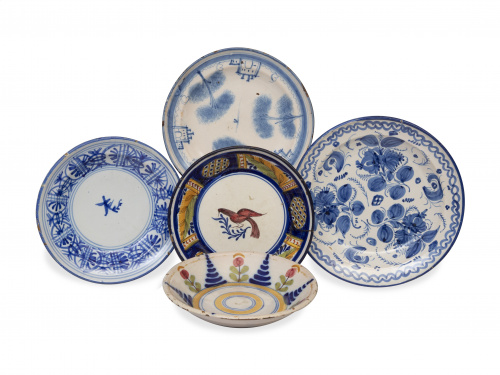 Cinco platos de cerámica esmaltada, uno con pajarito.