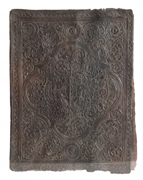 1175. Carpeta de piel grabada con roleos, círculos y aves.