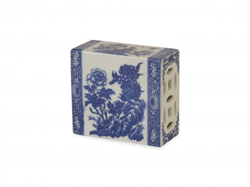 Almohada de porcelana esmaltada en azul y blanco con decoración floral.