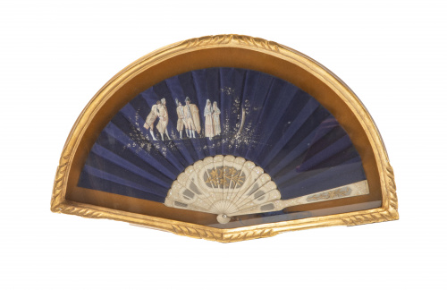 Abanico de seda pintada con padrones de marfil tallado, ff. del S. XIX.