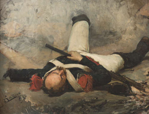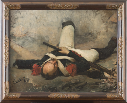 Nuestra magnífico lienzo, "Soldado muerto" es un estudio de la gran y monumental obra de Sorolla, "El dos de mayo de 1808", la defensa del parque de artillería de Monteleón durante el Levantamiento del 2 de mayo en Madrid. Segunda medalla de la Exposición Nacional de 1884, propiedad del Museo Nacional del Prado que, actualmente, se conserva en depósito en la Biblioteca Museo Víctor Balaguer de Villanueva y Geltrú en Barcelona. En un suelo repleto de cadáveres, apoyado en la rueda de un cañón y mortalmente herido por un disparo, se encuentra Velarde, mientras que Daoíz, de pie y sable en mano, intenta organizar la resistencia. A sus espaldas, envueltos en la bruma y el humo de la batalla, hombres y mujeres de toda clase y condición salen por la puerta del parque de Monteleón para enfrentarse a los franceses. En total, son más de 30 personajes los que componen la escena que está representada con un gran realismo y un profundo dramatismo. La ejecuta al aire libre, la técnica del "plein air" ya está presente desde sus primeros años, se levaba modelos y atrezzo a la plaza de toros de Valencia, bajo la luz del sol. Nuestra obra es una prueba del estudio y del interés de Sorolla por cuidar cada detalle de la composición final en cuanto al vestuario, posición, caracterización de los personajes, reconstrucción del ambiente. Nuestro protagonista es un soldado muerto, que por sus hombreras rojas lo identificamos con un soldado de tropa, que lleva su fúsil sobre su pecho en señal de lucha y defensa reflejando el patriotismo y hasta donde llegó el pueblo madrileño por la libertad contra los franceses.