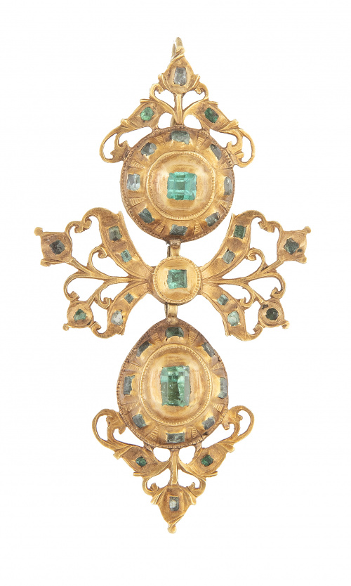 Cruz colgante popular S. XIX con esmeraldas en motivo de cruz, lazo y botón colgante