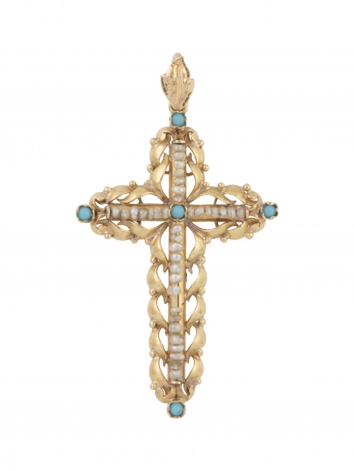 Cruz colgante de pp. S. XX con perlas de aljofar y turquesas en centro sobre marco de oro calado