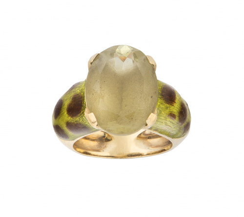 368. Sortija con peridoto de talla oval y bandas de esmalte con animal print a los lados