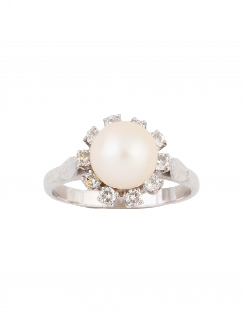 381. Sortija con perla orlada de diez brillantes engastados en garras