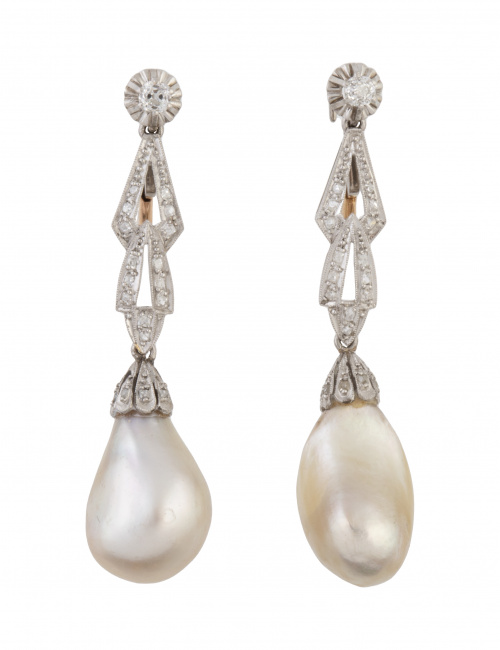 414. Pendientes largos años 30 con perillas de perlas barrocas colgantes, y diamantes en piezas geométricas articuladas, que penden de brillante superior
