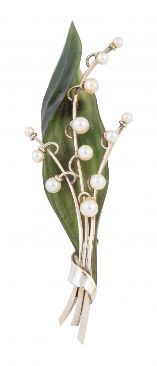 419. Broche Art-Decó con dseño de lírio del valle, con hoja de jade rodeada por perlas