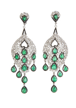 48. Pendientes largos orientales de oro con filigrana de motivos florales y remate inferior de bolitas colgantes