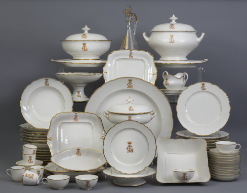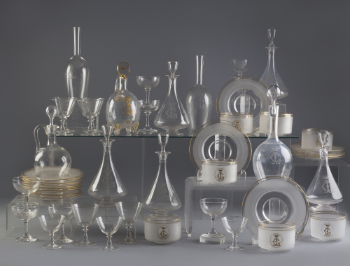 Vajilla de porcelana esmaltada y dorada a fuego, con iniciales "LC" entrelazadas bajo corona condal y cristalería juego en cristal incoloro, grabado a rueda y dorado.
