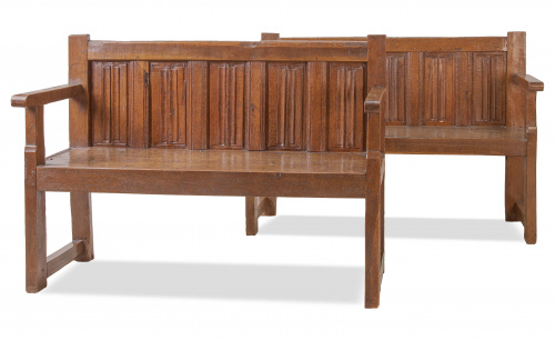 Pareja de bancos en madera tallada con talla de pergamino en el respaldo.