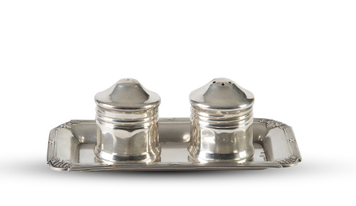 Bandeja de plata de Matilde Espuñes, (1909-1950) con salero y pimentero en metal plateado.