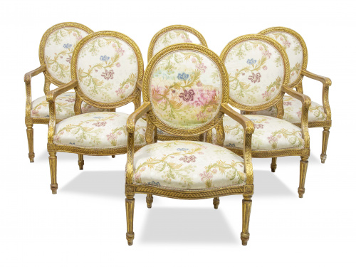 Lote de seis butacas en madera tallada y dorada, h. 1800.