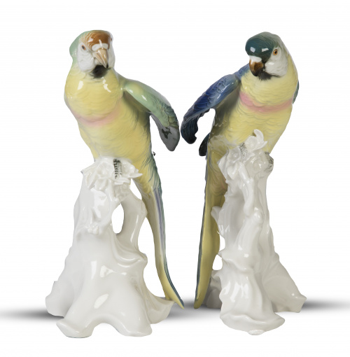 Pareja de loros de porcelana esmaltada. Con marcas en azul en la base.