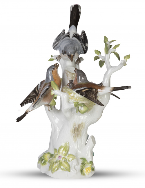 Grupo escultórico de porcelana esmlatada, con pinzones vulgares en ramas. Con marcas.