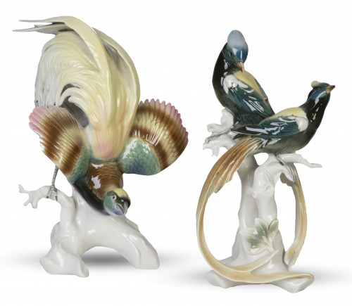 Lote de ave del paraíso y grupo escultórico con aves de porcelana.