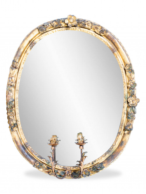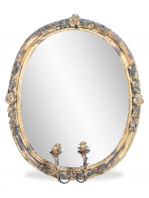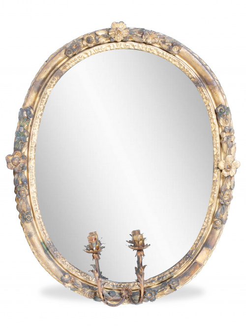 1166. Juego de tres espejos ovalados en madera tallada y dorada, con dos luces cada uno.