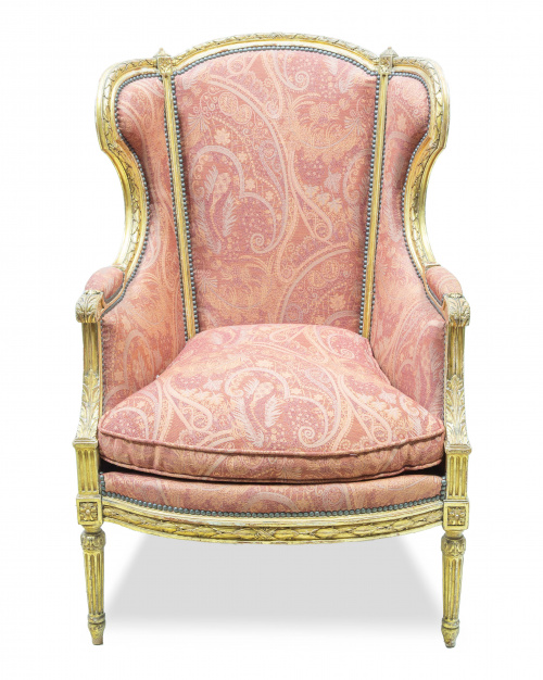 Butaca de orejas en madera tallada y dorada de estilo Luis XVI.
