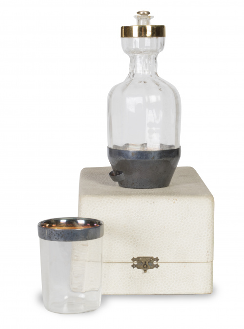 Estuche alfonsino con botella y vaso de cristal y plata para la mesilla de noche.