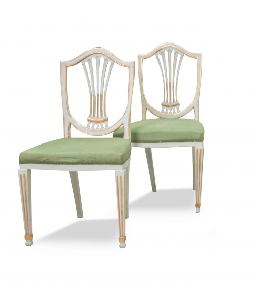 Pareja de sillas Carlos IV de madera tallada, calada, policromada y parcialmente dorada.