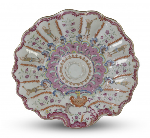 Mancerina de porcelana esmaltada con esmaltes de la familia rosa, para la exportación.
