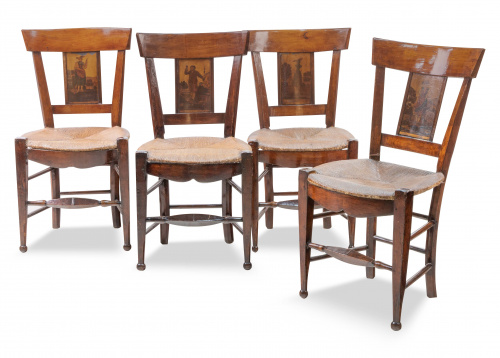 Juego de doce sillas de madera de nogal con el respaldo pintado con personajes populares.