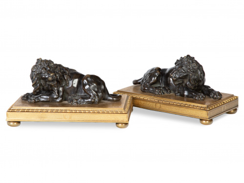 Pareja de leones de bronce pavonado, sobre peanas de bronce dorado.