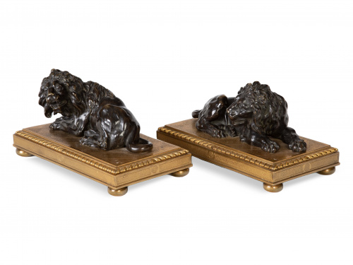 1268. Pareja de leones de bronce pavonado, sobre peanas de bronce dorado.