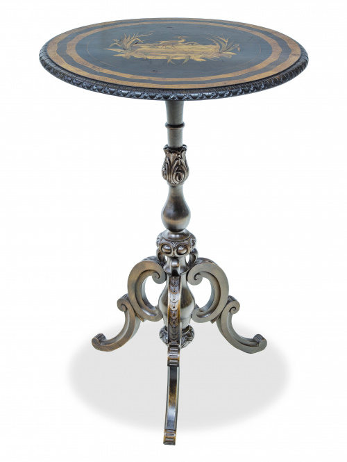 Velador con tapa con marquetería sobre pies de trípode, S. XIX.