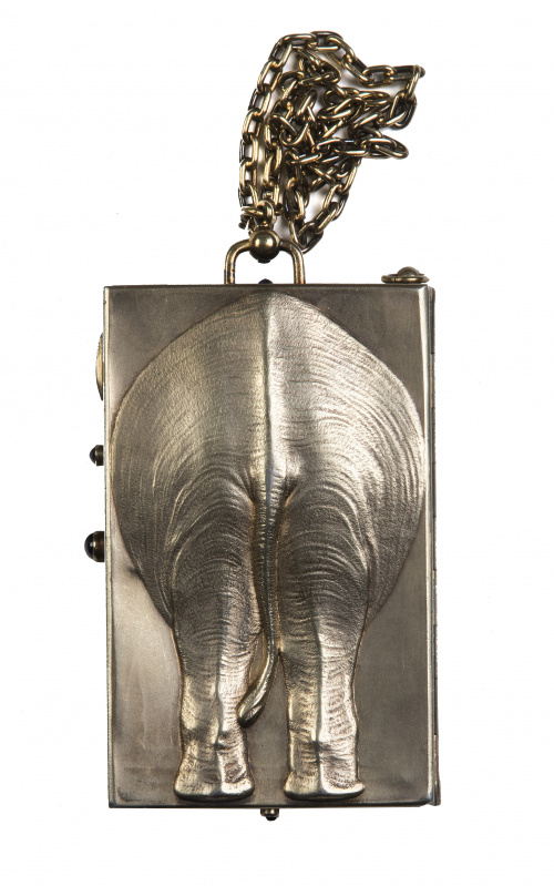 Con representación de elefante en relieve (anverso y reverso), interior compartimentado, cadena y lápiz.