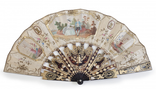 1342. Abanico con país en raso de seda con cartelas enmarcadas por lentejuelas y escenas pintadas a "gouache", padrones simulando carey, dorados y plateados.