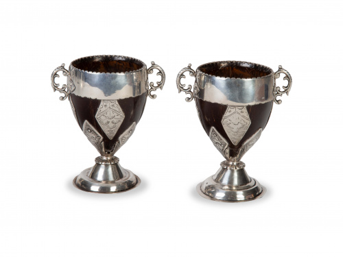 Home / SUBASTA DICIEMBRE 2021 / Pareja de cocos chocolateros engastados en plata, asas deco
