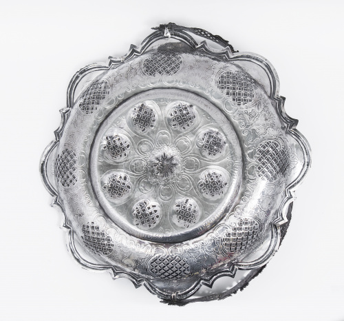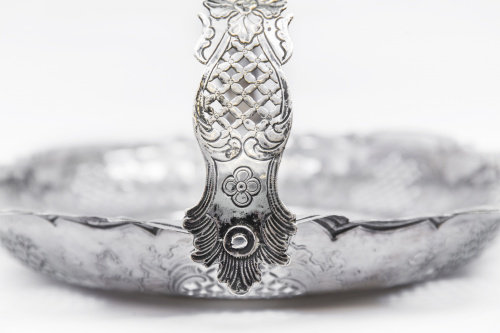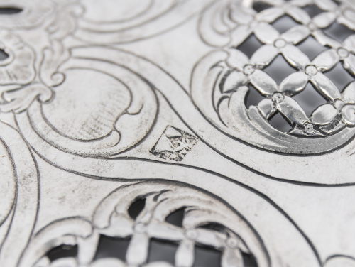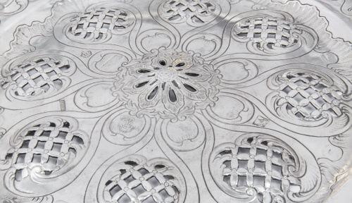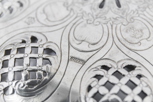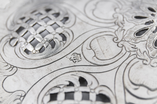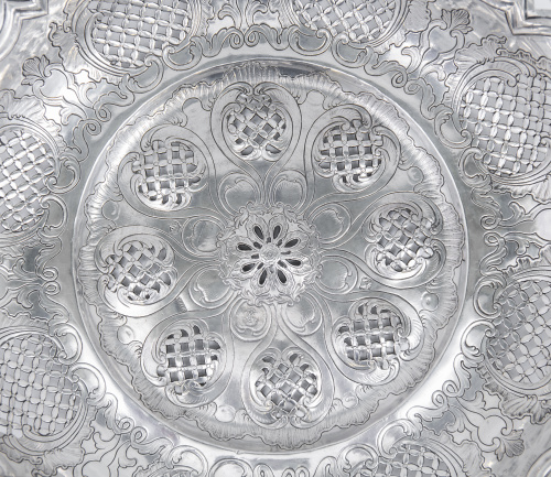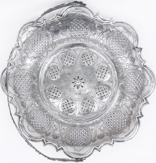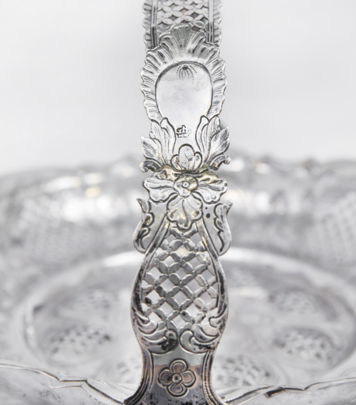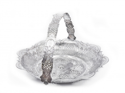 Estas cestas labradas en plata calada de origen francés y popularizadas por plateros hugonotes en Inglaterra durante el siglo XVIII son muy raras en la platería hispánica.