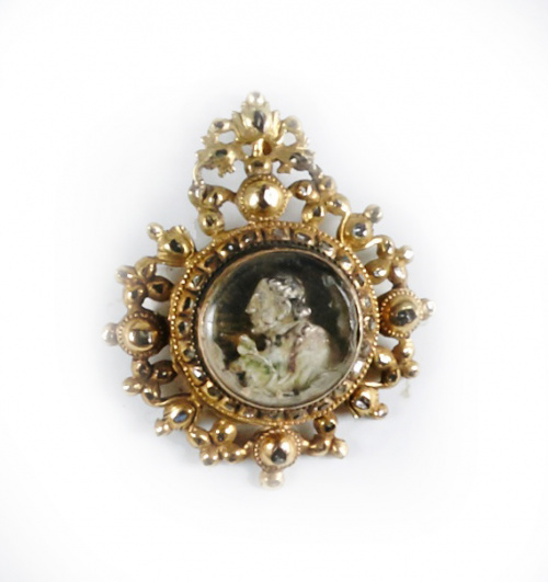 Medalla en oro de 20 quilates y brillantes con Cristo de perfil.Trabajo español, S. XVII-XVII..