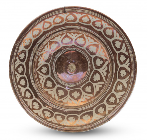 1398. Plato con tetón de cerámica de reflejo metálico.