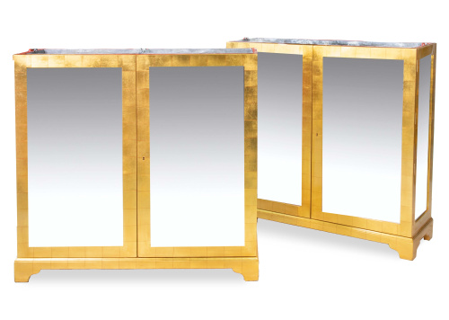 Pareja de cómodas de madera dorada y lacada de rojo con dos puertas con espejo, la parte superior para macetas. Con marcas.