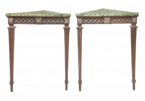 1418. Pareja de rinconeras con tapa imitando mármol, de madera tallada de estilo Luis XVI, S. XX.