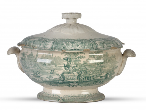 1433. Sopera con tapa en loza estampada en verde.