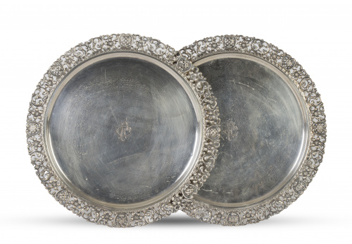 Lote de dos fuentes de plata con iniciales y alero calado, S. XX.
