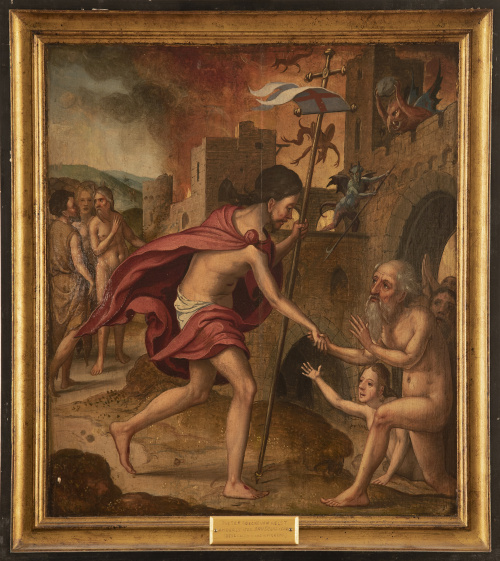 La tabla que presentamos inmortaliza el momento en el que Cristo desciende a los infiernos con la presencia de Adán, Eva y otras almas. Los demonios rebolotean y se dirigen de manera violenta a Cristo. La luz rojiza y amenazante de infierno inhunda la escena creando evidentes juegos de luces y sombras.