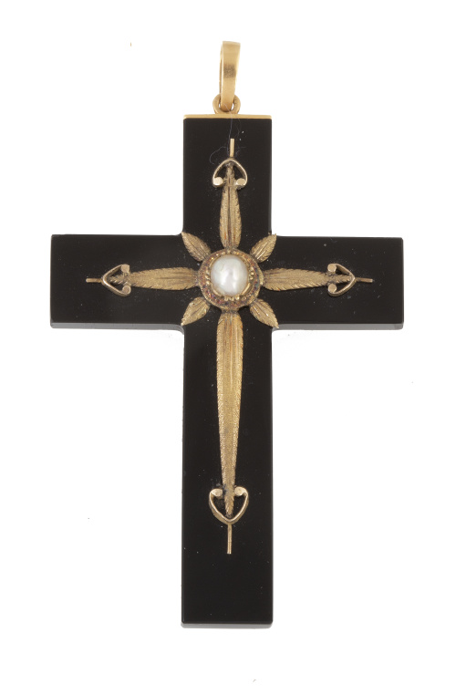 Cruz colgante S. XIX de ónix con cruz central aplicada en oro grabado con centro de perla fina