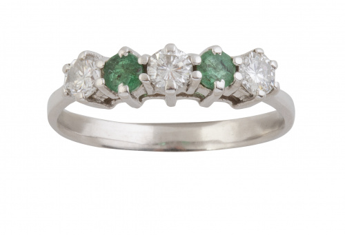 Sortija cintillo con tres brillantes y dos esmeraldas alternas engastadas en garras