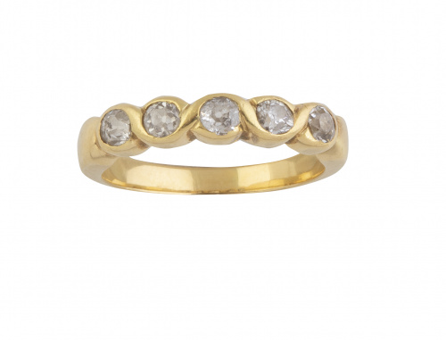 193. Sortija media alianza con cinco brillantes en marco en zig-zag