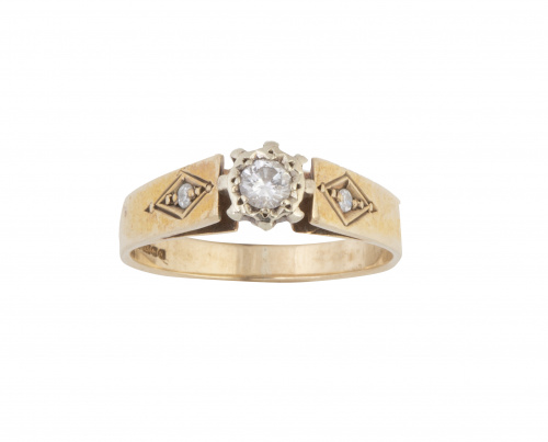 Sortija solitario de pp. S. XX con brillante central en montura adornada por rombos con un diamantito